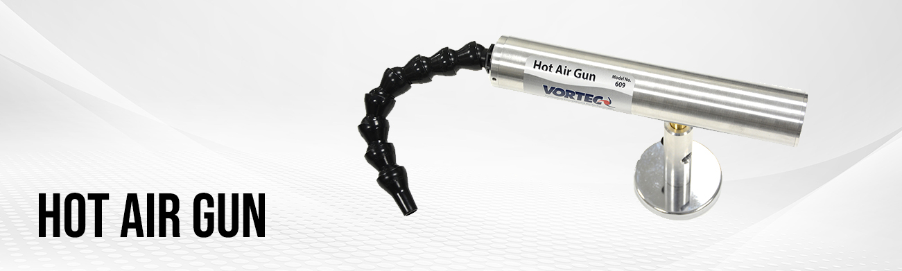 Hot Air Guns are used where milder heat is needed as compared to an electric heat gun. It is ideal for pre-heating of parts, processes and solutions, with an output flow rate of 2-8 scfm; and is also widely used for softening adhesives, rubber and vinyl, and accelerating drying. The hot air gun requires no electricity at the target, and uses only filtered compressed air to generate fully adjustable temperatures up to 200 deg F.